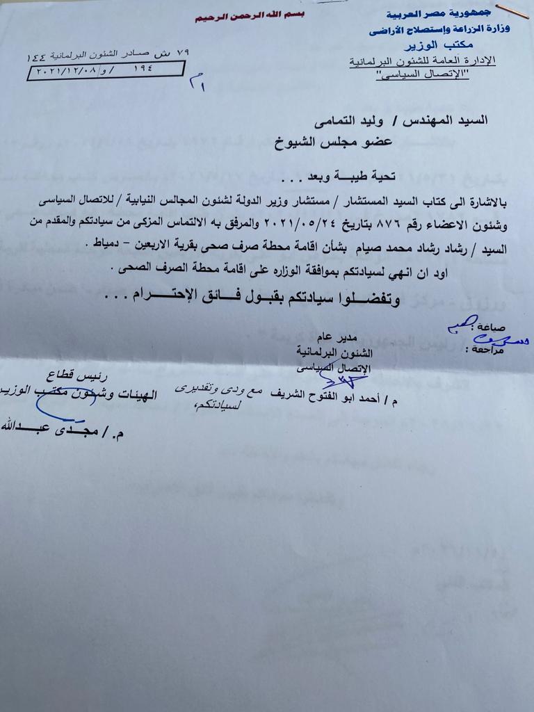 وافق وزير الزراعة السيد القصير على طلب نائب دمياط بمجلس الشيوخ وليد التمامى على تبوير قطعة أرض ٤٠٠متر تبرع من المواطنين لاقامة محطة رفع صرف صحي بقرية الأربعين