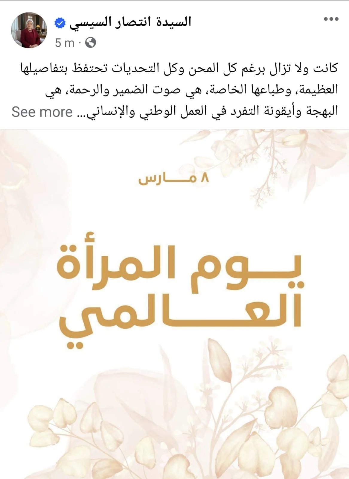 وجهت السيدة انتصار السيسى، قرينة رئيس الجمهورية، التحية لكل نساء مصر في يوم المرأة العالمي.