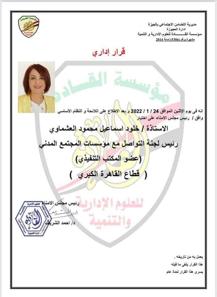 وجاء نص القرار انه في يوم الاثنين الموافق 24 /1 / 2022 بعد الإطلاع على اللائحة والنظلم الأساسي، وافق رئيس مجلس امناء مؤسسة القادة للعلوم الإدارية والتنمية الاجتماعية، علي إختيار السيدة خلود اسماعيل محمود العشماوي رئسا للجنة التواصل مع مؤسسات المجتمع المدني، وعضو بالمكتب التنفيذي بقطاع القاهرة الكبرى.