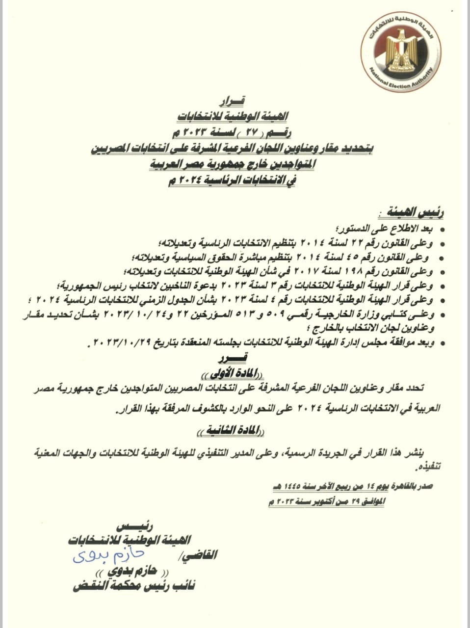 أصدرت الهيئة الوطنية للانتخابات برئاسة المستشار حازم بدوى نائب رئيس محكمة النقض، قرارا بعناوين اللجان الانتخابية فى مقار البعثات الدبلوماسية المصرية فى الخارج.