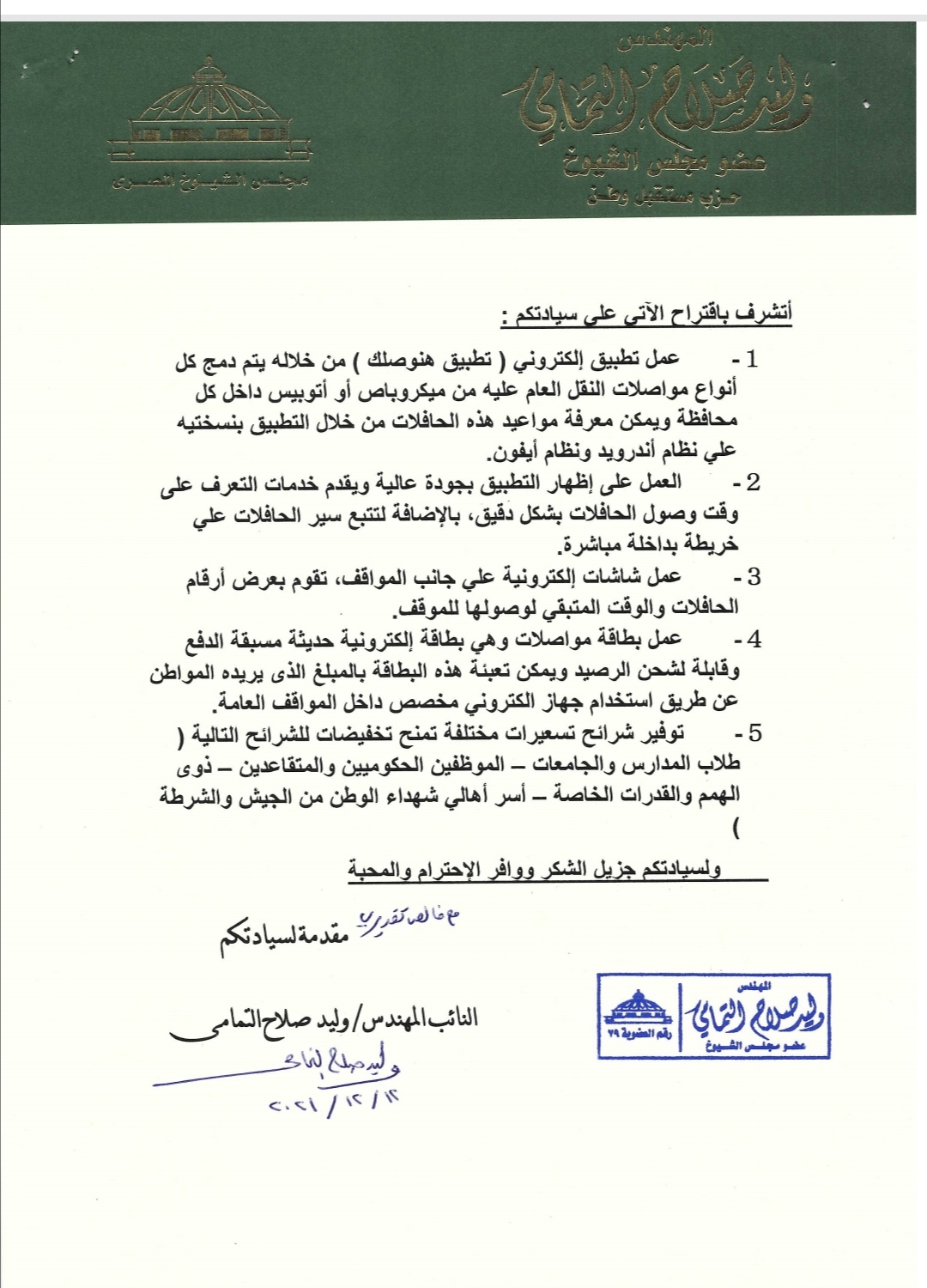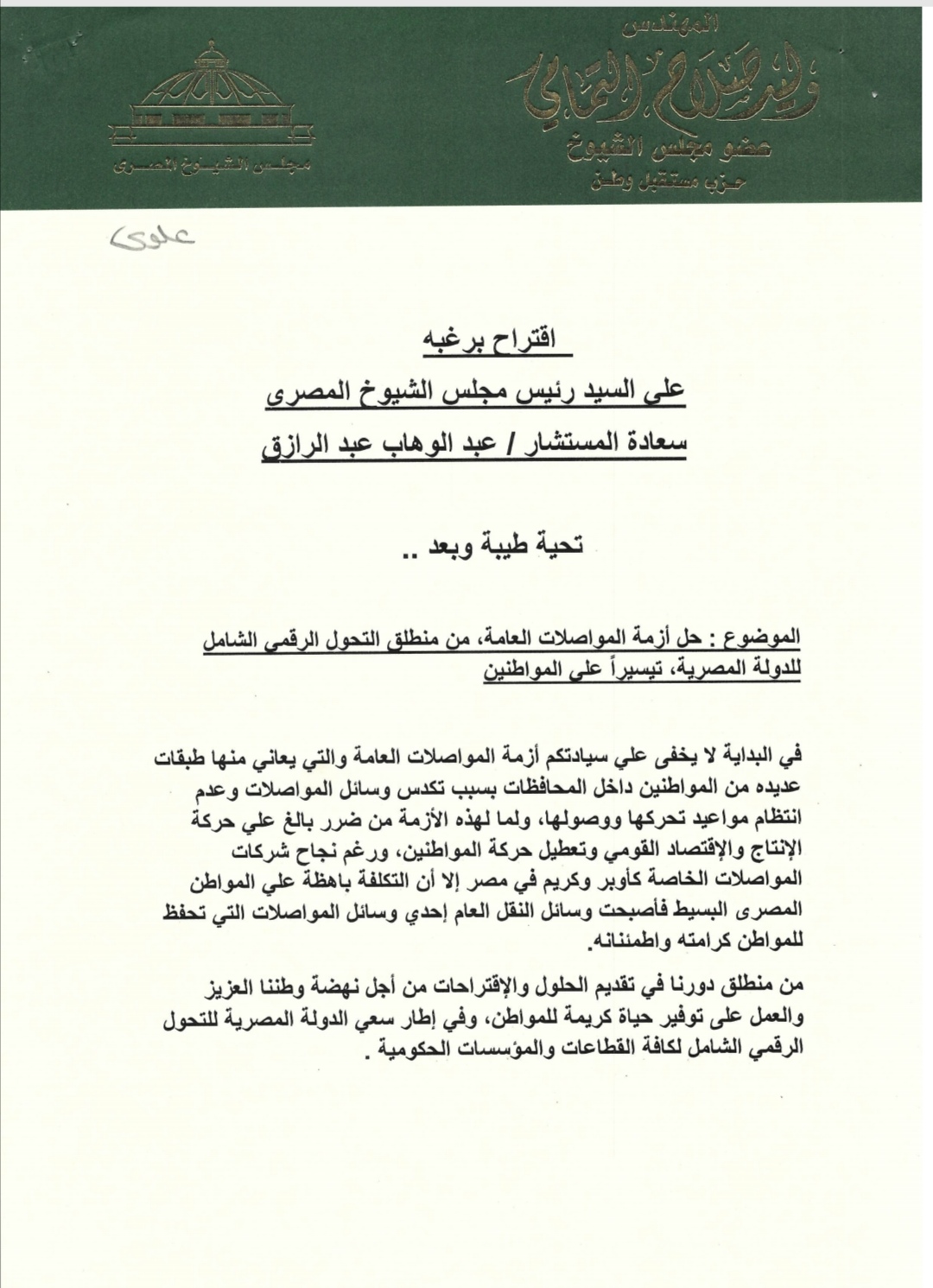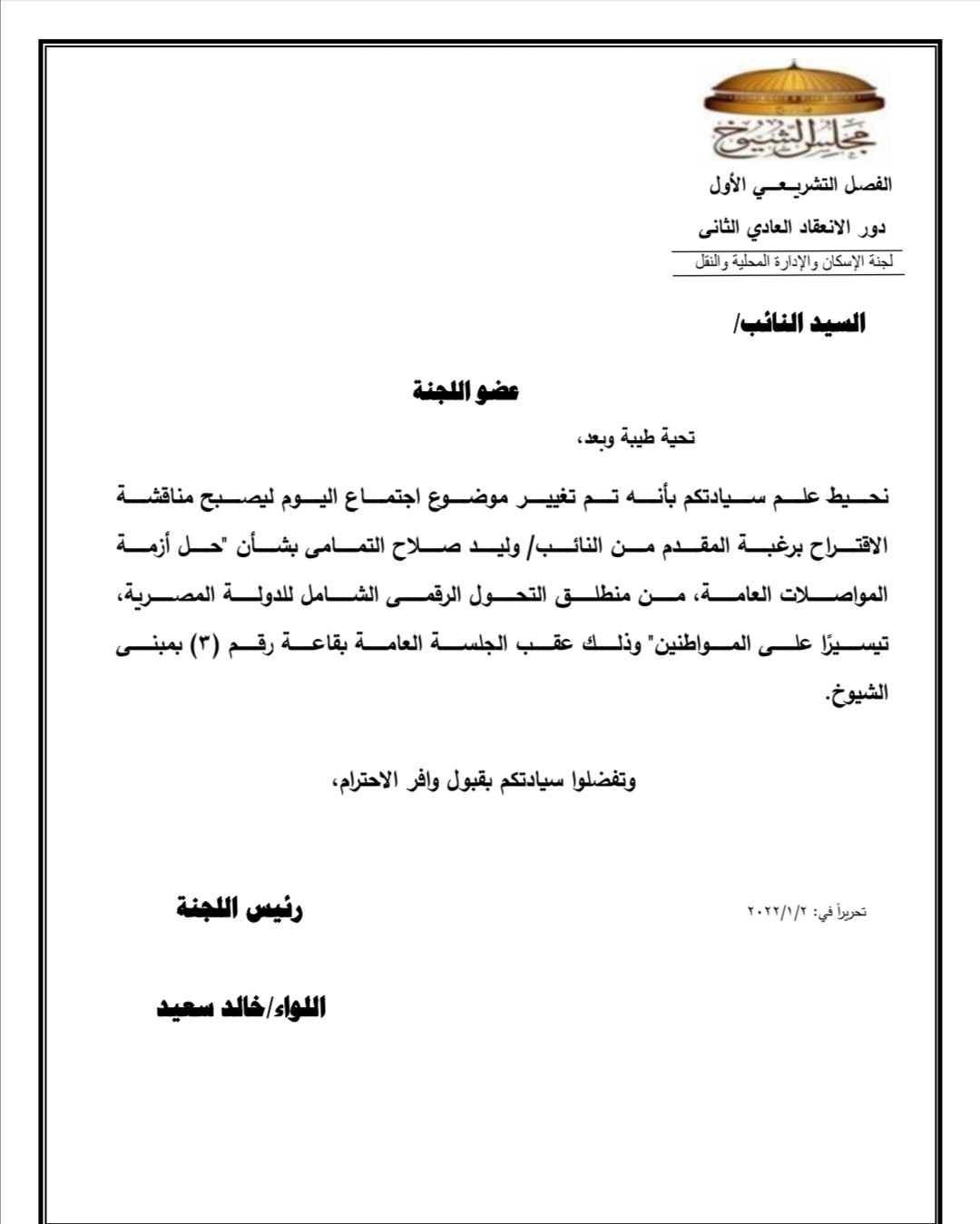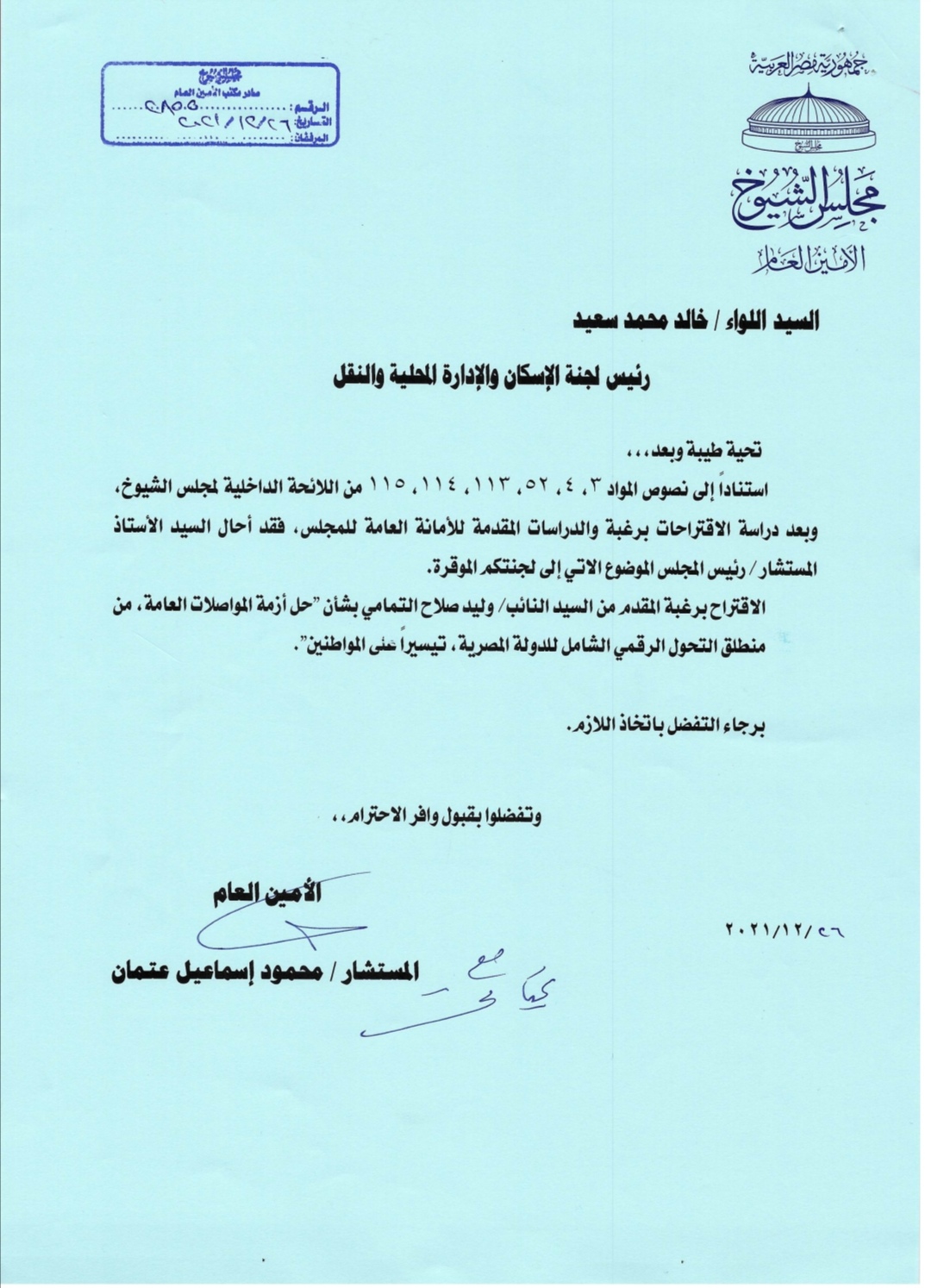 اول اقتراح برغبة امام لجان مجلس الشيوخ فى عام ٢٠٢٢ النائب وليد التمامى يطلب حل ازمة المواصلات فى ظل التحول الرقمى