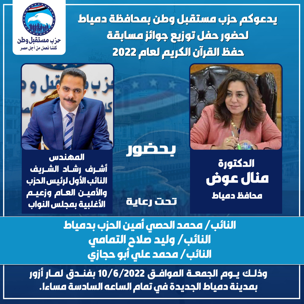 ينظم حزب مستقبل وطن بمحافظة دمياط حفل لتوزيع جوائز مسابقة حفظ القرآن الكريم لعام ٢٠٢٢يوم الجمعة ١٠يونيو بفندق لمار أزور بمدينة دمياط الجديدة