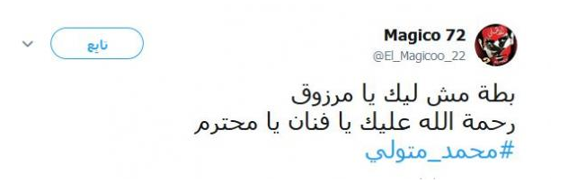 بعد وفاته بساعات، أصبح اسم الفنان الراحل محمد متولي، هو الأعلى بحثًا على موقع التواصل الاجتماعي “تويتر”، إذ أعرب العديد من مستخدميه عن حزنهم لوفاته، حتى تحول “تويتر” إلى منصة عزاء للراحل.