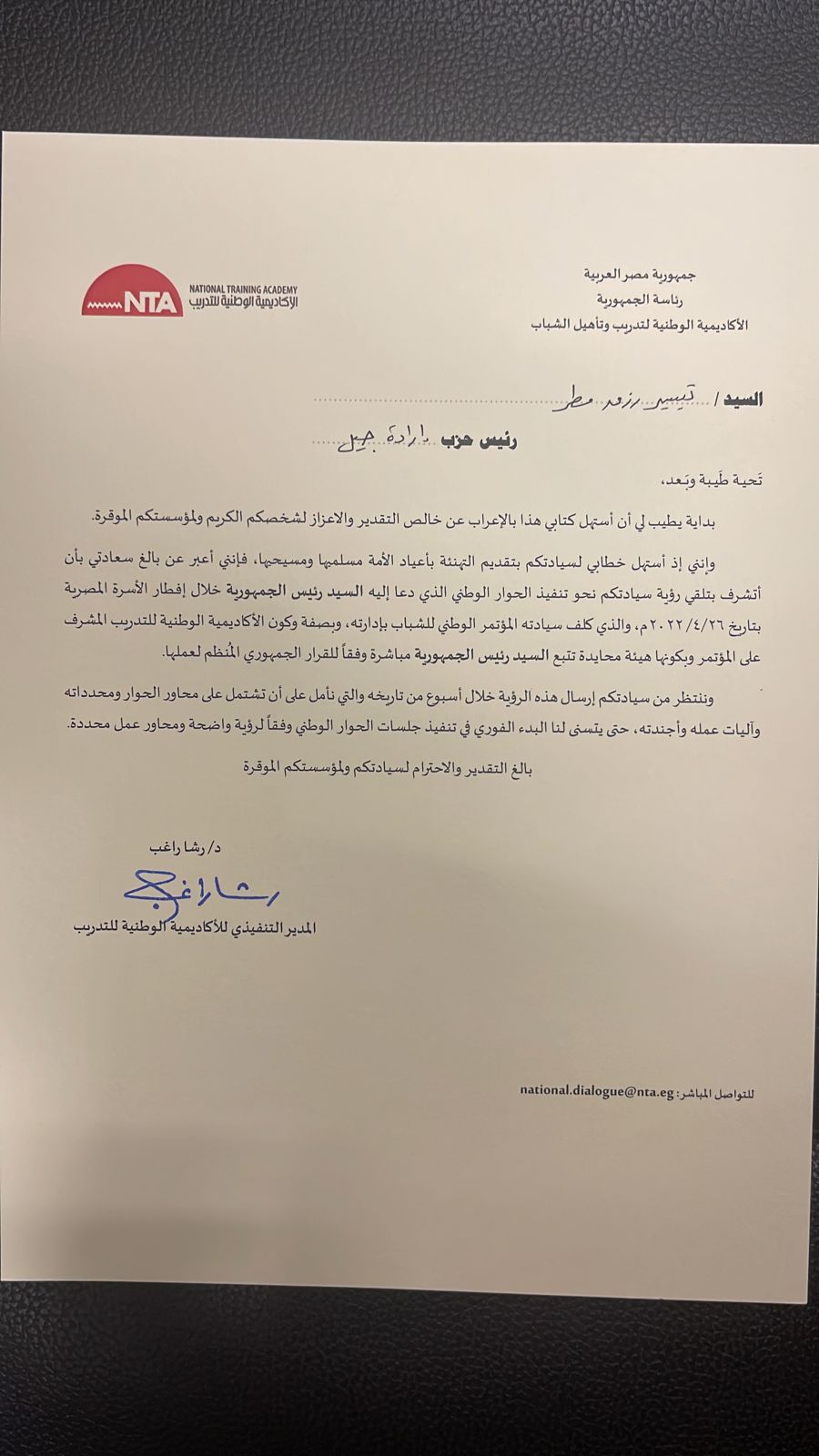 تيسير مطر رئيس حزب ارادة جيل يتلقى دعوة من الدكتورة رشا راغب المدير التنفيذى للاكاديمية الوطنية للتدريب بشان مؤتمر الحوار السياسى