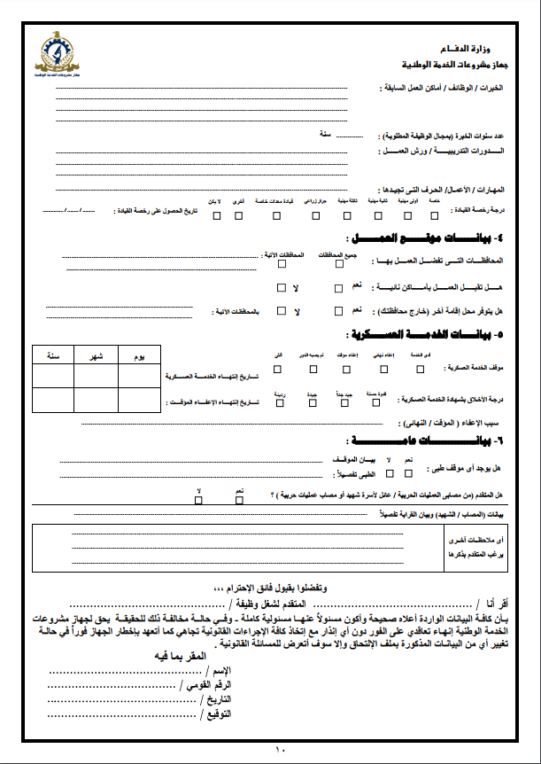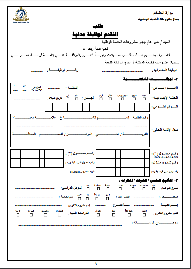 أعلن جهاز مشروعات الخدمة الوطنية، عن فتح باب الوظائف وذلك فى عدة مجالات، بمحافظات «القاهرة والإسكندرية، وبورسعيد، و القنطرة شرق، والسويس والعين السخنة، ورأس سدر، والعاشر من رمضان، والنوبارية، وبنى سويف، والمنيا، والفرافرة وأسوان، وشرق العوينات، وتوشكى».