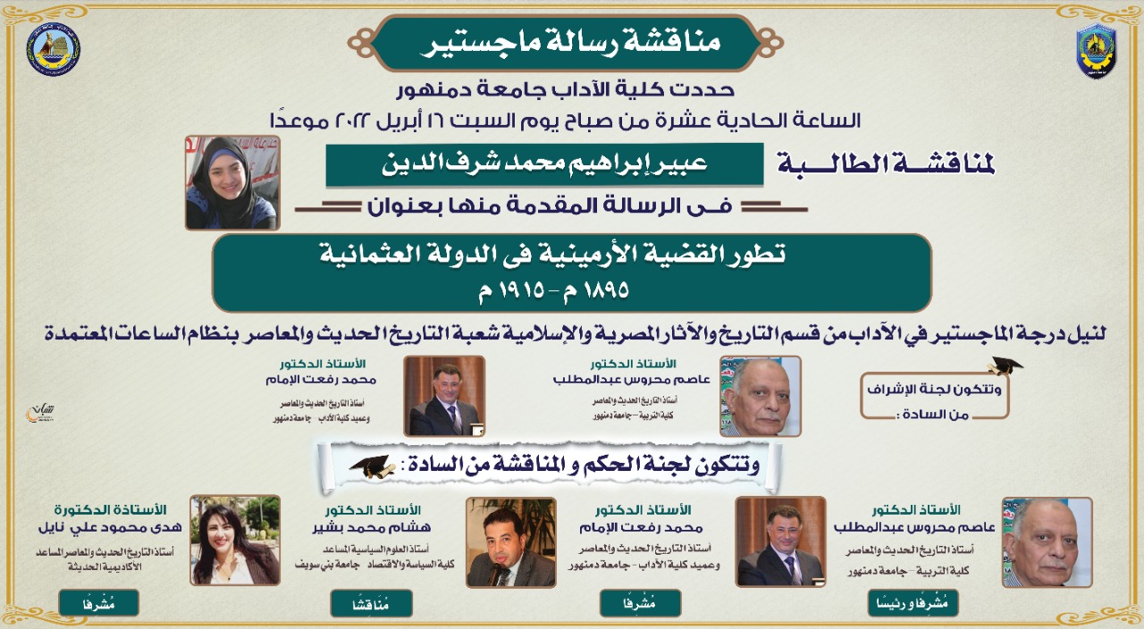 ناقشت كلية الآداب جامعة دمنهور اليوم السبت الموافق ٢٠٢٢/٤/١٦ رسالة ماجستير بعنوان : تطور القضية الأرمينية في الدولة العثمانية بنظام الساعات المعتمدة في الادب من قسم التاريخ والآثار المصرية والإسلامية شعبة التاريخ الحديث والمعاصر .. للباحثة المتميزة : عبير إبراهيم محمد شرف الدين ..