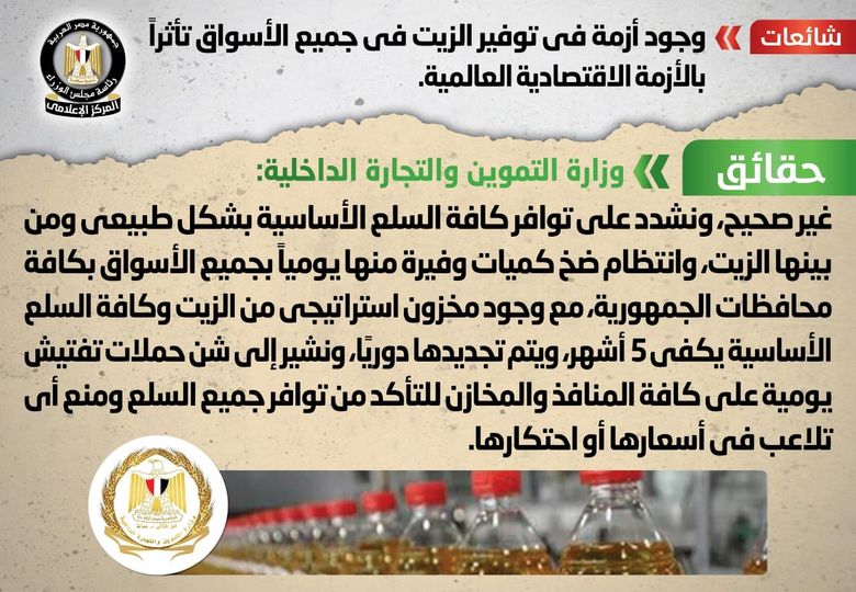 انتشر في بعض المواقع الإلكترونية وصفحات التواصل الاجتماعي أنباء بشأن وجود أزمة في توفير الزيت في جميع الأسواق تأثراً بالأزمة الاقتصادية العالمية، وقد قام المركز الإعلامي لمجلس الوزراء بالتواصل مع وزارة التموين والتجارة الداخلية، والتي نفت تلك الأنباء، مُؤكدةً أنه لا صحة لوجود أزمة في توفير الزيت في أي من الأسواق تأثراً بالأزمة الاقتصادية العالمية، مُشددةً على توافر كافة السلع الأساسية بشكل طبيعي ومن بينها الزيت، وانتظام ضخ كميات وفيرة منها يومياً بجميع الأسواق بكافة محافظات الجمهورية، مع وجود مخزون استراتيجي من الزيت وكافة السلع الأساسية يكفي5 أشهر، ويتم تجديدها دوريًا، مُشيرةً إلى شن حملات تفتيش يومية على كافة المنافذ والمخازن للتأكد من توافر جميع السلع ومنع أي تلاعب في أسعارها أو احتكارها.