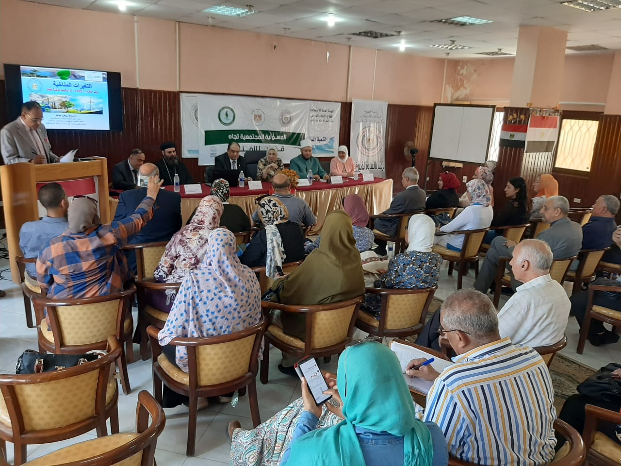وتحدث الدكتور سامح رياض رئيس الادارة المركزية لجهاز شئون البيئة بغرب الدلتا، عن اهمية الحوار المجتمعى في طرح افكار ومقترحات وحوار متبادل حول التغيرات المناخية، و واكد إن نسبة الانبعاثات المنبعثة في مصر تمثل 0.6٪ من إجمالي الإنبعاثات العالمية، وان اهم اسباب زيادة تركيزات غازات الاحتباس الحراري هي المخلفات الصلبة والعمليات الصناعية والزراعية وحرائق الوقود، و أن تغطية المناطق بالثلوج في بعض ميادين المحافظة ، و تغير الملامح المناخية للموسم الشتوي و الصيفي، و تقلص المساحة الرملية في بعض الشواطئ والازدياد المطرد في درجات الحرارة وتغير معدلات سقوط الامطار تعد من أهم مؤشرات ظاهرة التغيرات المناخية.