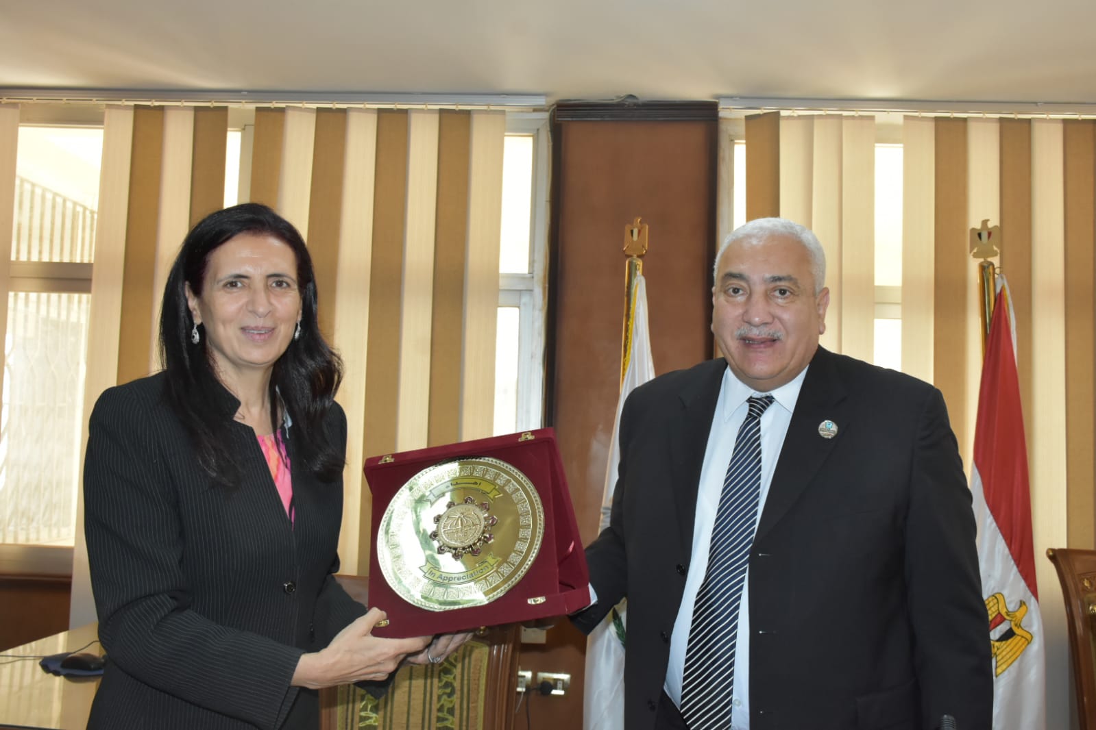 وقد قدم رئيس الجامعة درع الجامعة للدكتوره ماجى نصيف تقديرا لدورها فى مساعدة الباحثين بالجامعة