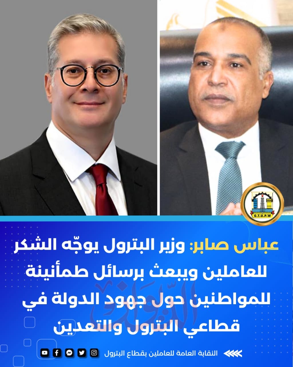 عباس صابر: وزير البترول يوجّه الشكر للعاملين ويبعث برسائل طمأنينة للمواطنين حول جهود الدولة في قطاعي البترول والتعدين