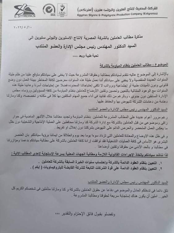 واكد العاملين انهم يطالبون ادارة الشركة بتعينهم، حيث انهم مر عليهم اكثر من ٨ سنوات يعملون بعقد مياومة ، وتم الوعد من قبل الادارة بالتعيين والتثبيت اكثر من مرة وحتي الان لم يتم تنفيذ هذة الوعود.
