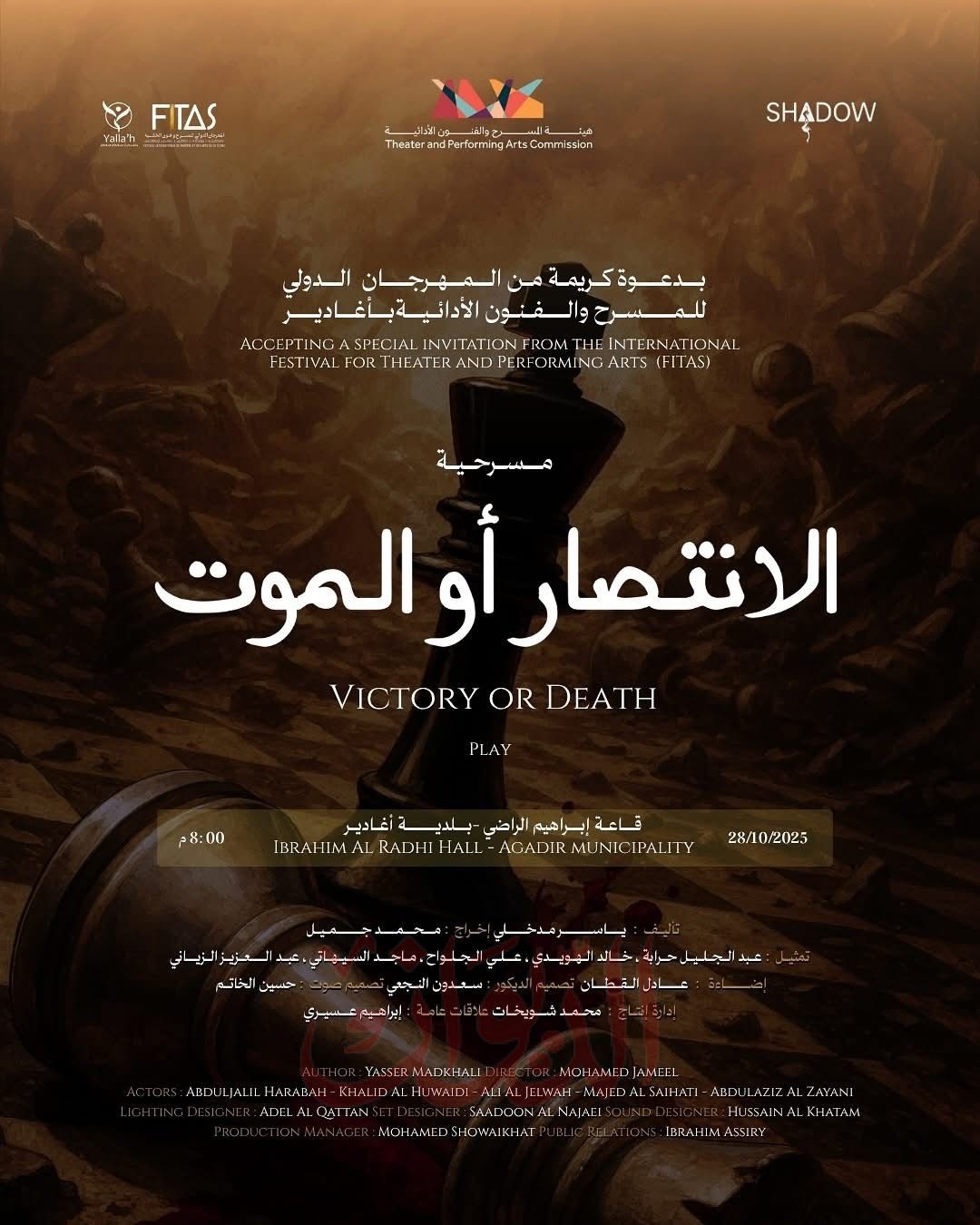 وتشارك الفرقة بعرضها المسرحي “الانتصار أو الموت”، المأخوذ عن نص “الانتصار أو الموت أو كلاهما” للكاتب ياسر مدخلي، ومن إخراج محمد جميل، وبطولة كل من: عبد الجليل حرابة، ماجد السيهاتي، علي الجلواح، خالد الهويدي، وعبد العزيز الزياني ، تصميم صوت: حسين الخاتم ، إضاءة: عادل القطان ، إدارة إنتاج: محمد شويخات ، تصميم الديكور: سعدون النجعي ، علاقات عامة: إبراهيم عسيري.