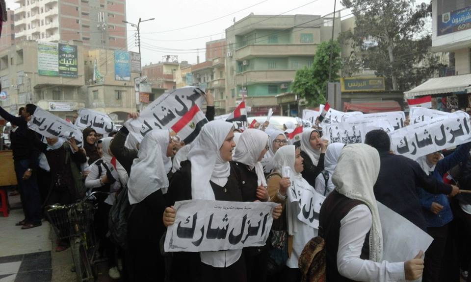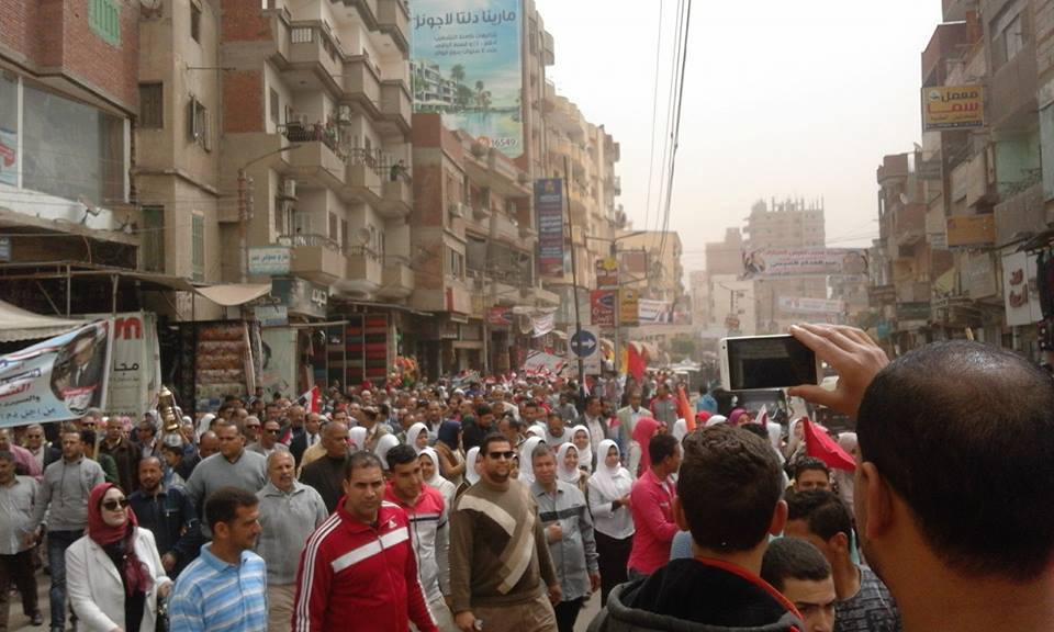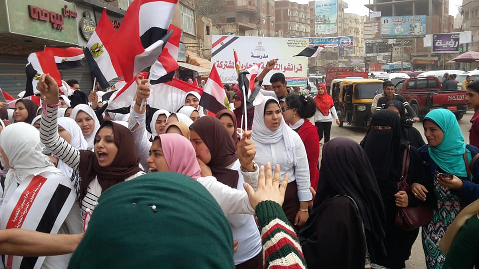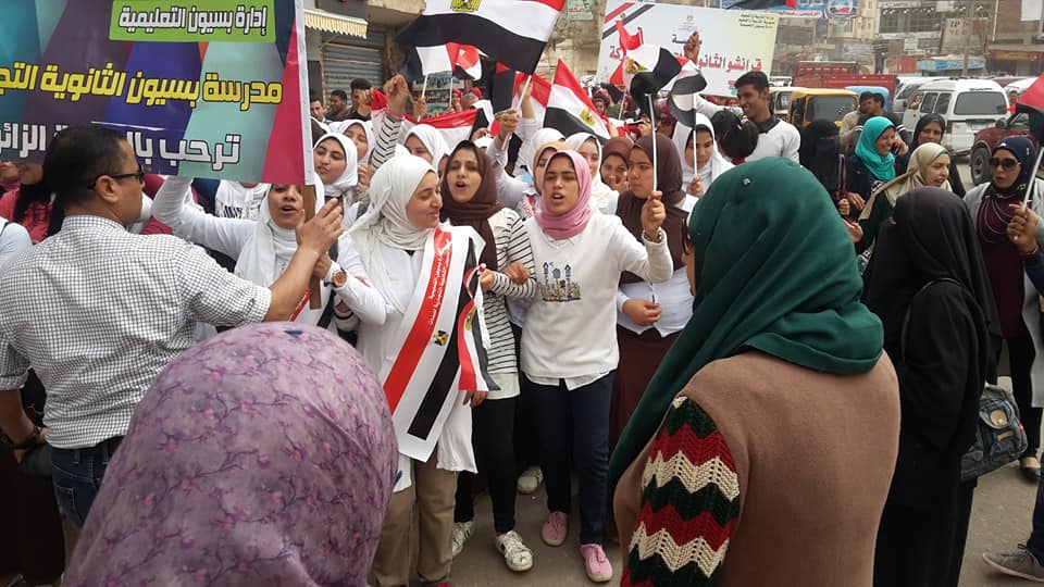 خرجت المسيرة يتقدمها الدكتورة سهام رزق مدير إدارة بسيون التعليمة، ومئات المعلمين والطلبة من جميع المدارس الحكومية والخاصة والعاملين بالادارة التعليمية ، حاملين الإعلام المصرية، وصور الرئيس ولافتات مكتوب عليها ” انزل شارك”” مصر بلدنا”” تحيا مصر”