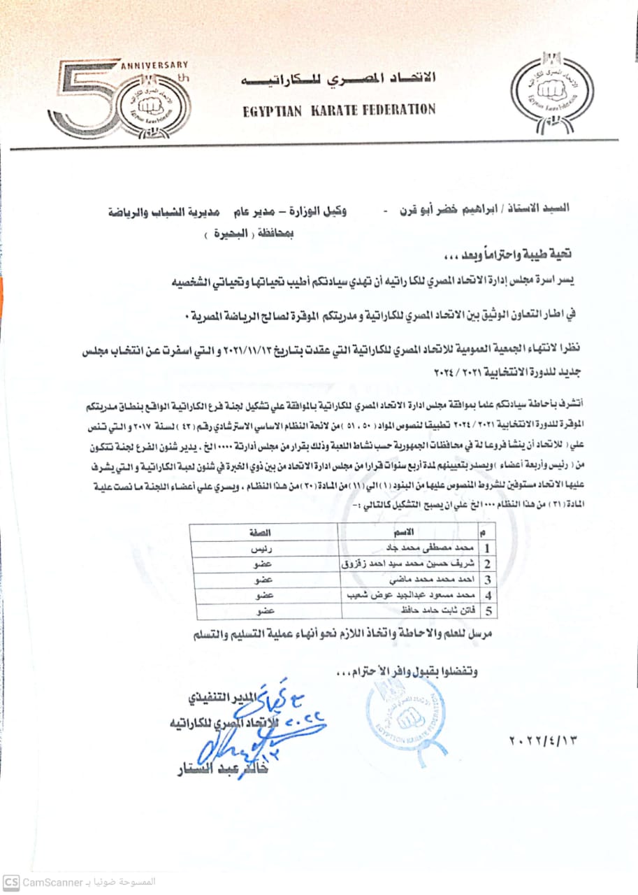 أعتمد مجلس إدارة الإتحاد المصري للكاراتية، برئاسة الكابتن، محمد الدهراوي، تشكيل مجلس إدارة الإتحاد بمحافظة البحيرة.