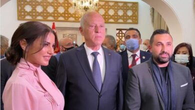 درة وزوجها ولطيفة وعلى معلول مع الرئيس قيس سعيد بالسفارة التونسية بالقاهرة