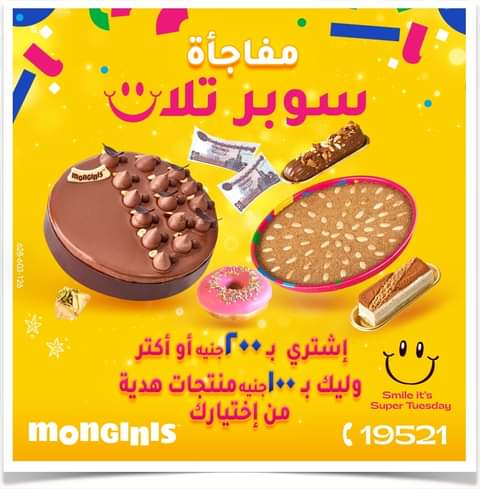 وتقدم مونجيني عرض الثلاثاء القادم كلاكيت تاني مرة أحد أقوى عروض سوبر تلات بأن تشتري منتجات بمبلغ 200 جنيه تحصل على منتجات هدية بمبلغ 100جنيه والعرض ساري من الساعة 8 صباحاً وحتى الساعة 12 مساءاً في كل فروع المجموعة