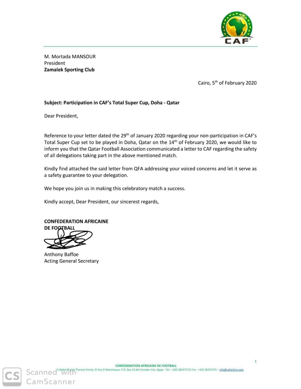 تلقي نادي الزمالك خطابا اليوم من الاتحاد الافريقي لكرة القدم ” الكاف” يؤكد فيه تعهد الاتحاد القطري لكرة القدم بتأمين وضمان سلامة بعثة الفريق الأول لكرة القدم بالنادي خلال خوض مباراة السوبر الإفريقي أمام فريق الترجي الرياضي التونسي والمقررة إقامتها في الدوحة يوم 14 فبراير الحالي.