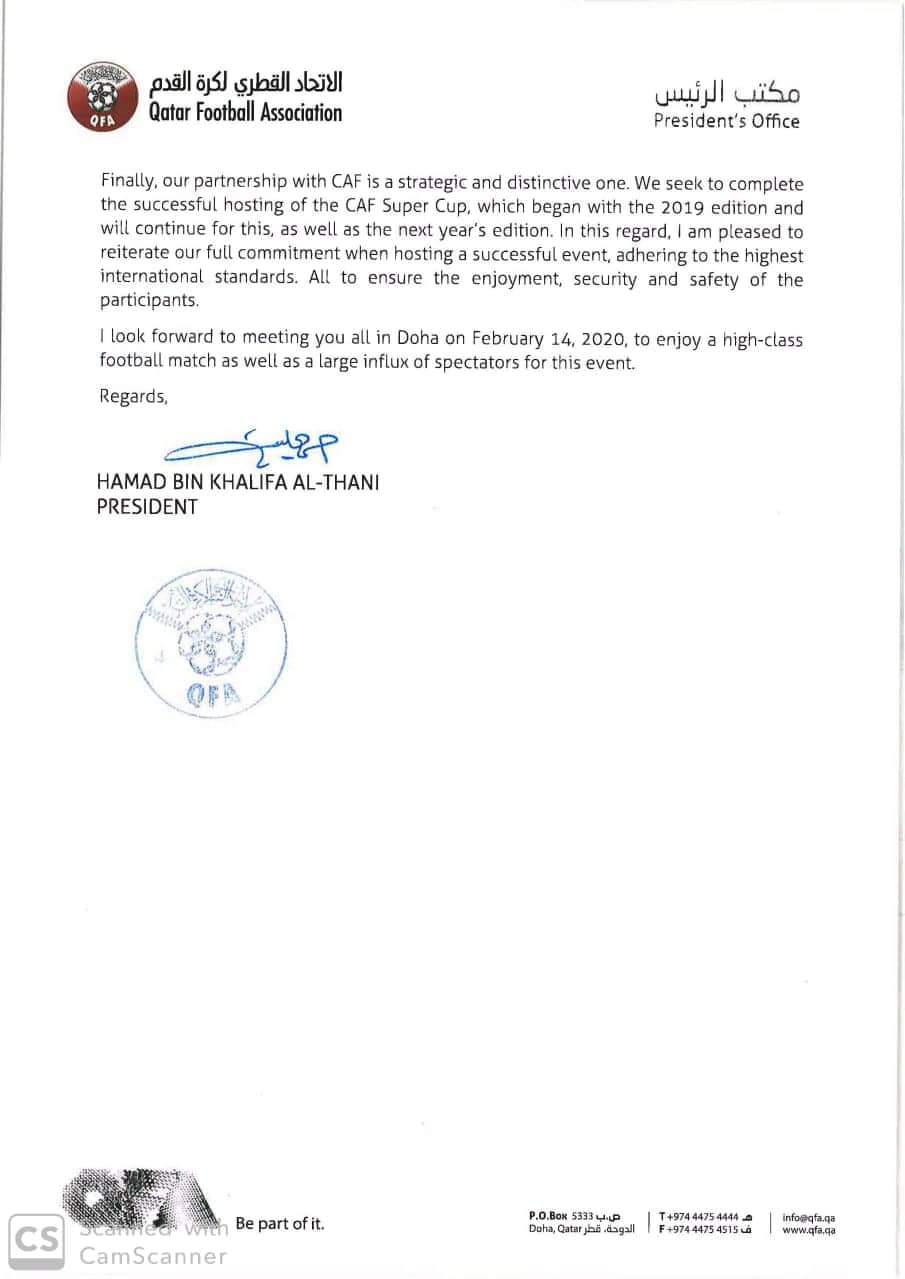 وأوضح خطاب الاتحاد القطري للكاف: ” نسعى لاستكمال الاستضافة الناجحة لكأس السوبر الافريقي، والتي بدأت مع نسخة 2019 ، بالإضافة إلى نسخة العام المقبل.. ونؤكد من جديد التزامنا الكامل عند استضافة هذا الحدث، والتقيد بأعلى المعايير الدولية.. كل ذلك لضمان تمتع وأمن وسلامة جميع المشاركين باللقاء.. نتطلع إلى لقائكم جميعًا في الدوحة في 14 فبراير 2020 ، للاستمتاع بمباراة كرة قدم عالية المستوى بالإضافة إلى تدفق كبير من المتفرجين لهذا الحدث الهام