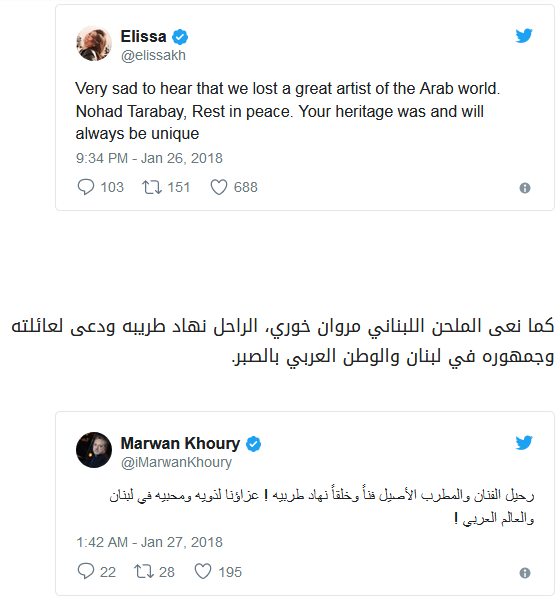 كما نعى الملحن اللبناني مروان خوري، الراحل نهاد طريبه ودعى لعائلته وجمهوره في لبنان والوطن العربي بالصبر.