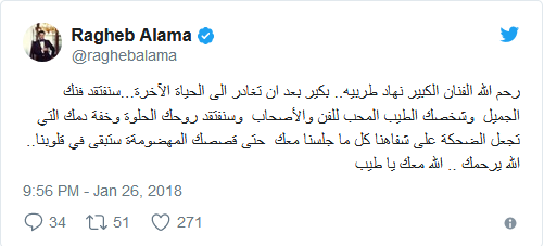 وكتب راغب علامة، أنه سيفتقد فن الراحل وشخصيته الطيبة المحبة للأصدقاء، كما سيفتقد روحه وخفة ظله.