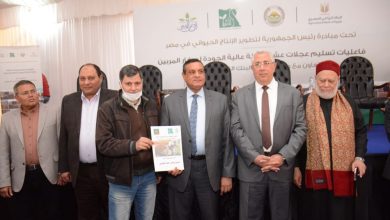 بالصور ….وزير الزراعة ومحافظ البحيرة ورئيس مجلس أمناء مؤسسة مصر الخير ورئيس البنك الزراعي يسلمون عقود توزيع عجلات عشار على صغار المربين